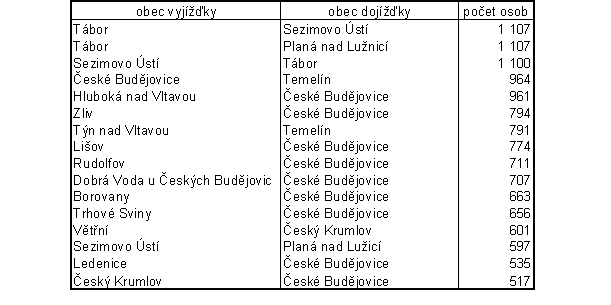 Z 19 směrových proudů s počtem osob 500 a více se jednalo v 16 případech o vyjížďku v rámci kraje, ve zbývajících 3 případech se jednalo o vyjížďku z Českých Budějovic (760 osob), Písku (583 osob) a Tábora (580 osob) do Prahy. Nejvíce těchto proudů (11) připadlo na okres České Budějovice, dále na okres Tábor 5, Český Krumlov 2 a Písek 1 směrový proud. Nepatrně pod hranicí 500 osob byla vyjížďka z obcí Borek (478 osob), Hrdějovice (465), Kamenný Újezd (486), Včelná (464) a Velešín (489) do Českých Budějovic. Zajímavá je skutečnost, že denně vyjíždí z Tábora do Sezimova Ústí zhruba 1 100 osob a tentýž počet cestuje i opačným směrem.