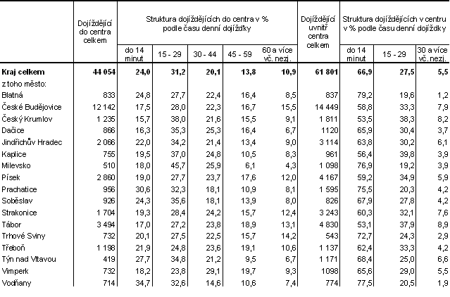 Na strukturu dojíždějících uvnitř centra podle času denní dojížďky měla vliv především jeho velikost, lokalizace škol a jejich dostupnost i používané dopravní prostředky. Naprostá většina žáků, studentů a učňů se v rámci města dostala do škol do 1/2 hodiny, podíl těch, kterým cesta trvala déle než hodinu se pohyboval od 1,2 % v Blatné po 8,9 % v Táboře.