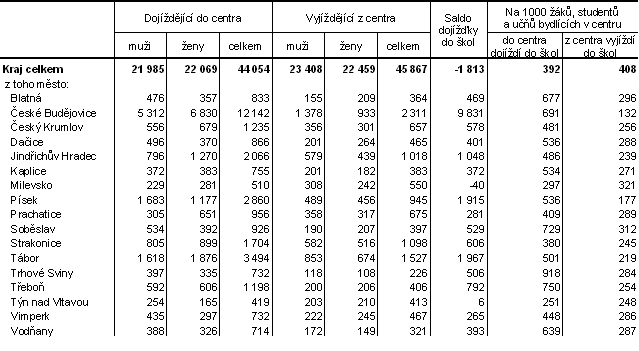 Z celkového počtu dojíždějících do škol do obcí kraje jich přes 12 tis. (27,6 %) směřovalo do Českých Budějovic. Následoval Tábor s téměř 3,5 tis. dojíždějících. V souhrnu za všechna centra představovala dojížďka do jejich škol 73 % celkové dojížďky v kraji. Vyjížďka z center byla podstatně menší, pouze z Milevska více žáků, studentů a učňů vyjíždělo než dojíždělo, což se odrazilo v záporném saldu dojížďky. Největší kladné saldo dojížďky mají České Budějovice (přes 9,8 tis.), Tábor (téměř 2 tis.) a Písek (přes 1,9 tis.).