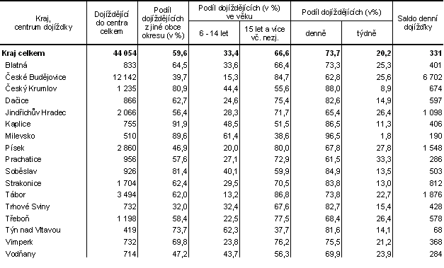Převažující typ školy, do níž se do centra dojíždí, měl vliv i na podíl dětí ve věku 6 – 14 let na celkovém počtu dojíždějících žáků, studentů a učňů. V průměru za kraj tvořili žáci do 14 let třetinu dojíždějících, v jednotlivých centrech byl však tento podíl značně rozdílný. Nejvyšší byl v dojížďce do Týna nad Vltavou a Milevska (přes 60 % dojíždějících), nejnižší do Tábora (13,2 %), Českých Budějovic (15,3 %) a Písku (20 %). Význam center vzrůstal s věkem dojíždějících, neboť se zde soustřeďují školy zajišťující přípravu na budoucí povolání. Zatímco z dojíždějících žáků jich do center směřovala o něco více než polovina (51,5 %), z mládeže nad 15 let to byla většina (83,8 %). Mezi jednotlivými centry existovaly rozdíly ve věkové struktuře dojíždějících. Přes 80 % dojíždějících do škol do centra představovali učni a studenti v Českých Budějovicích, Písku a Táboře. Naproti tomu v Milevsku a Týně nad Vltavou měli nadpoloviční většinu žáci do 15 let.