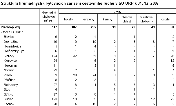 Podle struktury hromadných ubytovacích zařízení je zřejmé, že v Plzeňském kraji převažují penziony, které tvoří téměř 40% všech ubytovacích kapacit. Stejná situace nastává i v jednotlivých ORP s nejvyšším počtem HUZ v kraji (Klatovy a Sušice). Větší podíl na celkových ubytovacích kapacitách představují ještě hotely (21% z celkové kapacity HUZ).