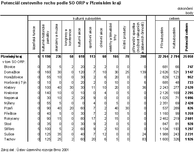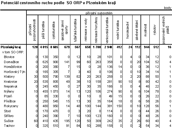 Z hodnocení potenciálu cestovního ruchu vyplývá, že nejvyšší dosaženou hodnotu v kraji má správní obvod ORP Domažlice (3 147 bodů). Poměrně vyšších hodnot (přes 2 000 bodů) dosáhly i ORP Klatovy, Kralovice, Nýřany, Rokycany a Sušice. Nejméně bodů získal ORP Blovice a Horšovský Týn.