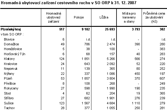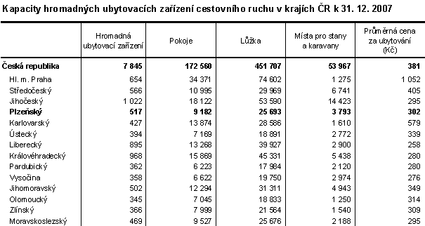 K 31. 12. 2007 bylo v Plzeňském kraji pro potřeby cestovního ruchu 517 hromadných ubytovacích zařízení (dále jen HUZ) s 9 182 pokoji a 25 693 lůžky. V rámci ČR to byl šestý nejvyšší počet HUZ. Nejvyšší počet HUZ má kraj Jihočeský (1 022) a hned za ním kraj Královéhradecký (968).
