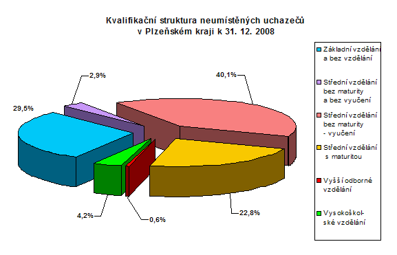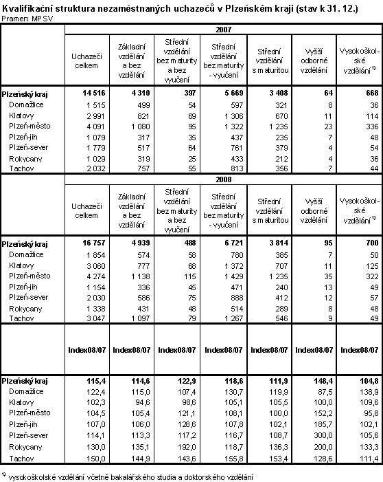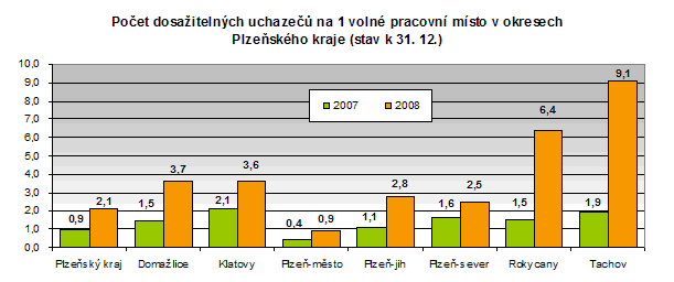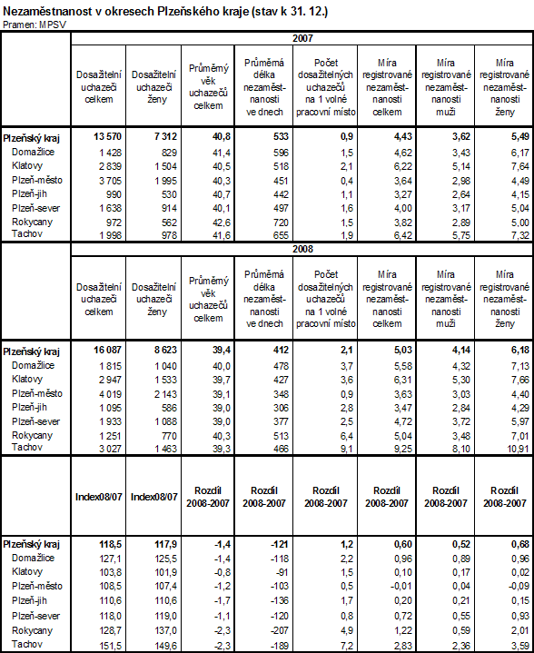 NEZAMĚSTNANOST V PLZEŇSKÉM KRAJI K 31. 12. 2008 dosáhla v Plzeňském kraji míra registrované nezaměstnanosti (dle MPSV) 5,03%. V hodnocení podle nejnižší míry registrované nezaměstnanosti se Plzeňský kraj umístil na pátém místě za Královéhradeckým krajem a před Pardubickým krajem, v meziročním porovnání se postavení Plzeňského kraje na trhu práce zhoršilo. Na celkovém zvýšení míry registrované nezaměstnanosti v kraji se podílel především okres Tachov. Míra registrované nezaměstnanosti se meziročně zvýšila o 2,83 procentních bodů a byla nejvyšší mírou v Plzeňském okraji. Rostoucí nezaměstnanost v okrese nejvíce poznamenala krize probíhající v automobilovém průmyslu. Počet dosažitelných uchazečů na 1 volné pracovní místo se meziročně zvýšil o sedm dosažitelných uchazečů. Vyšší nezaměstnanost v okrese je ovlivněna celou řadou faktorů: nižší kvalifikace pracovní síly, řídká osídlenost okresu (okres s nejnižší hustotou v Plzeňském kraji) a současně nevyhovující dopravní obslužnost pro venkovská sídla, která leží mimo dopravní osu D5 Praha - Rozvadov. Druhá nejvyšší míra registrované nezaměstnanosti byla zaznamenána v okrese Klatovy, k 31. 12. 2008 činila 6,31%. Okres Klatovy patří tradičně k okresům s vyšší mírou nezaměstnanosti. Nezaměstnanost je trvale nepříznivě ovlivněna velkým počtem malých venkovských sídel, nízkou hustota obyvatelstva, vyšší nadmořskou výškou a především špatnou dopravní obslužností. Začínající hospodářská krize se na celkové výši nezaměstnanosti zatím příliš neprojevila, protože míra registrované nezaměstnanosti se meziročně zvýšila jen o 0,10 procentních bodů. Na jedno volné pracovní místo připadli přibližně čtyři dosažitelní uchazeči. Třetí nejvyšší míry registrované nezaměstnanosti bylo dosaženo v okrese Domažlice. Míra registrované nezaměstnanosti se meziročně zvýšila téměř o 1 procentní bod, představovala třetí nejrychleji rostoucí nezaměstnanost v Plzeňském kraji. Propouštění zaměstnanců postihlo především firmy, ve kterých je výroba orientována na automobilový průmysl. K 31. 12. 2008 připadli na jedno volné pracovní místo přibližně čtyři dosažitelní uchazeči. Okres Rokycany se stal okresem s druhou nejrychleji rostoucí mírou registrované nezaměstnanosti, která se meziročně zvýšila o 1,22 procentních bodů. Růst nezaměstnanosti v okrese byl rovněž ovlivněn probíhající krizí v automobilovém průmyslu. Počet dosažitelných uchazečů na jedno volné pracovní místo se meziročně zvýšil o téměř pět uchazečů. ![]() Míra registrované nezaměstnanosti v okrese Plzeň-sever patřila ke třetí nejnižší v kraji, meziročně se zvýšila 0,72 procentních bodů. K udržení relativně nízké míry nezaměstnanosti přispívá zázemí města Plzně. Počet dosažitelných uchazečů na jedno volné pracovní místo se meziročně zvýšil přibližně o jednoho uchazeče. ![]() Stabilní míra registrované nezaměstnanosti v meziročním porovnání zůstala v okresech Plzeň-město a Plzeň-jih. Okres Plzeň-město představuje silné ekonomické, průmyslové centrum. Tradice vyspělé průmyslové výroby je spojena s vysokou kvalifikací dostupné pracovní síly a pestrým zázemím středního a vysokého školství. Míra registrované nezaměstnanosti (3,63%) byla druhou nejnižší v Plzeňském kraji. Ze všech okresů Plzeňského kraje dosáhl okres Plzeň-město nejlepšího umístění v počtu dosažitelných uchazečů na 1 volné pracovní místo. K 31. 12. 2008 připadl na 1 volné pracovní místo přibližně jeden dosažitelný uchazeč. Nejnižší míry registrované nezaměstnanosti k 31. 12. 2008 bylo dosaženo v okrese Plzeň-jih (3,47%). Nízká nezaměstnanost je ovlivněna dobrým dopravním spojením s Plzní a ochotou obyvatel dojíždět za prací. K dalším faktorům nízké nezaměstnanosti přispívá i osidlování okresu plzeňskými obyvateli (výstavba rodinných domů), kteří jsou trvale zaměstnáni, a tím i částečně přispívají k udržení nízké nezaměstnanosti v okrese. Nabídka volných pracovních míst v okrese byla naopak v porovnání s okresem Plzeň-město slabší. Na jedno volné pracovní místo připadli přibližně tři dosažitelní uchazeči. ![]() V meziročním porovnání se na trhu práce zhoršila situace i pro dosažitelné uchazeče absolventy a mladistvé, v Plzeňském kraji se zvýšil jejich počet o 62,3%. Z okresů Plzeňského kraje dopadly nejhůře okresy Rokycany a Tachov. V okrese Rokycany vzrostl meziročně počet těchto uchazečů o více než pětinásobek, v okrese Tachov o více než dvojnásobek. Naopak nejmenší meziroční zvýšení dosažitelných absolventů a mladistvých (7,9%) bylo zjištěno v okrese Plzeň-město. Meziroční růst zdravotně postižených uchazečů v Plzeňském kraji činil 13,6%. Nejvíce se zvýšil počet zdravotně postižených uchazečů v okresech Domažlice o 47,8% a Rokycany o 35,6%, naopak v okrese Plzeň-město se počet těchto uchazečů snížil o 5,8%. Z hlediska meziročního vývoje podle kvalifikační struktury nezaměstnaných dosáhla v Plzeňském kraji nejnižšího zvýšení skupina vysokoškolsky vzdělaných uchazečů. Meziroční zvýšení této skupiny představovalo 4,8%. Nejrychleji rostla skupina uchazečů s vyšším odborným vzděláním o 48,4%. Z hlediska absolutního počtu nezaměstnaných v Plzeňském kraji byl zjištěn nejnižší počet uchazečů ve skupině s vyšším odborným vzděláním. K 31. 12. 2008 činila tato skupina z celkového počtu uchazečů jen 0,6%. I když tato skupina představuje nejnižší počet uchazečů o zaměstnání, mezi absolventy VOŠ existuje vyšší nesoulad mezi získaným v