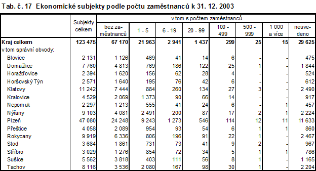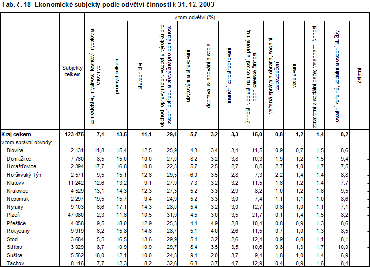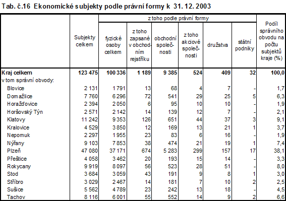 V registru ekonomických subjektů bylo v kraji koncem roku 2003 evidováno 123 475 subjektů, z toho největší počet 38,1% v SO ORP Plzeň, nejmenší počet 2 131 (1,7%) připadá na SO ORP Blovice. Z hlediska právní formy největší počet subjektů jsou fyzické osoby, těch bylo koncem roku 100 336 tj. 81,3%. Vůbec nejmenší podíl počtu fyzických osob měl správní obvod Tachov s 73,9%. V kraji bylo 524 akciových společností, z nichž přes polovinu (57,1%) sídlilo v SO ORP Plzeň, 44 v SO ORP Klatovy, 29 v SO ORP Domažlice a 28 v SO ORP Rokycany. Společností s ručením omezením bylo nejvíce evidováno v SO ORP Plzeň (4 796), Klatovy (577) a Rokycany (482).
