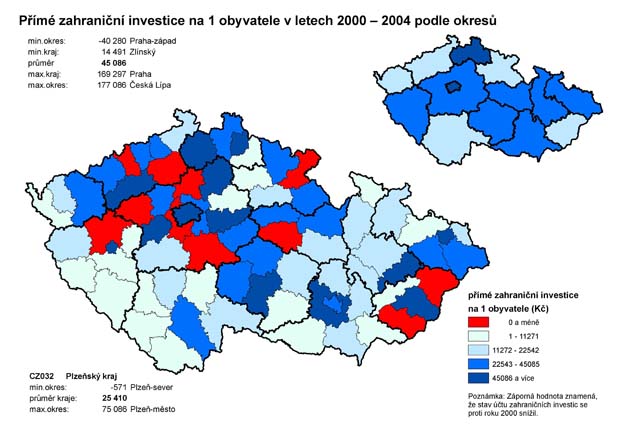 20. Přímé zahraniční investice na 1 obyvatele v letech 2000 - 2004 podle okresů