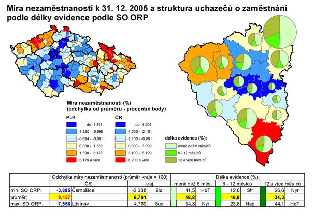 33. Míra nezaměstnanosti k 31. 12. 2005 a struktura uchazečů o zaměstnání podle délky evidence podle SO ORP