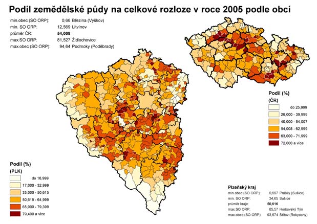 15. Podíl zemědělské půdy na celkové rozloze v roce 2005 podle obcí