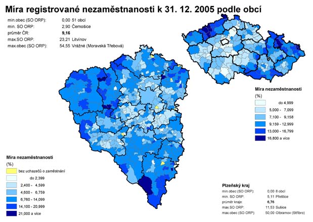 21. Míra registrované nezaměstnanosti k 31. 12. 2005 podle obcí