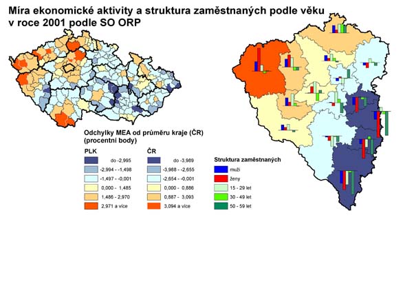 30. Míra ekonomické aktivity a struktura zaměstnaných podle věku v roce 2001 podle SO ORP