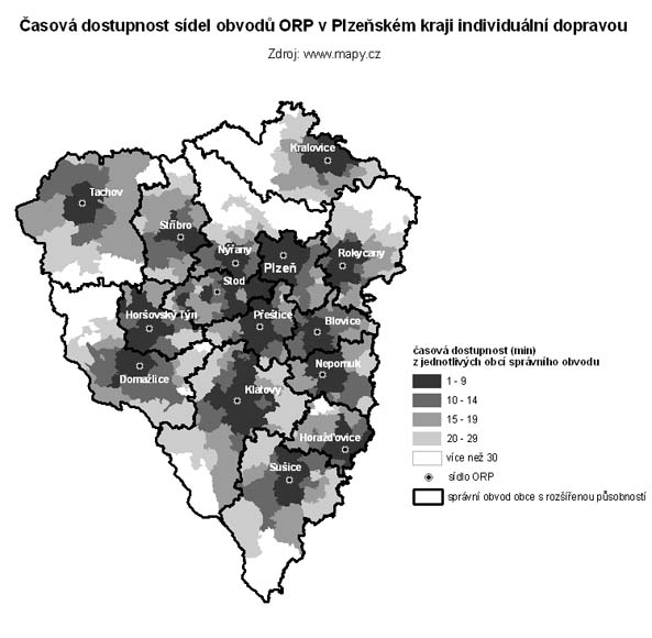 6. Časová dostupnost sídel obvodů ORP v Plzeňském kraji individuální dopravou