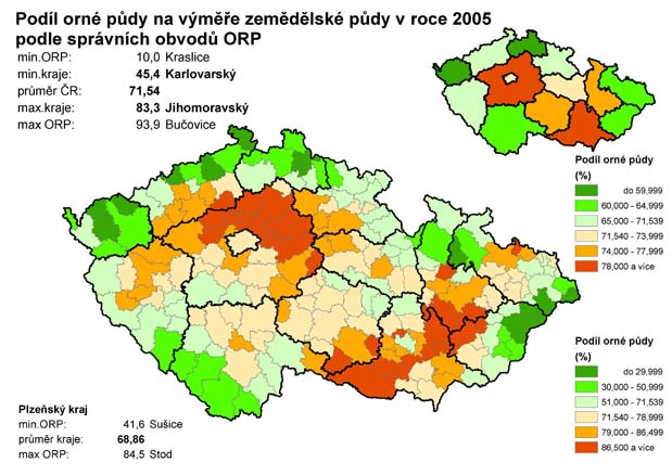 16. Podíl orné půdy na výměře zemědělské půdy v roce 2005 podle správních obvodů ORP