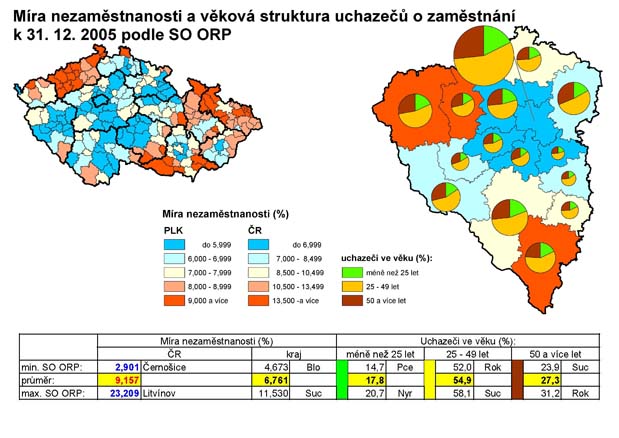 32. Míra nezaměstnanosti k 31. 12. 2005 a věková struktura uchazečů o zaměstnání podle SO ORP