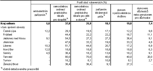 · Zdravotnictví v Libereckém kraji zabezpečovalo celkem 19 ambulantních zařízení, 228 samostatných ordinací praktického lékaře pro dospělé, 119 ordinací pro děti a dorost (včetně detašovaných pracovišť) a 102 lékáren. Síť zdravotnických zařízení doplňuje 10 nemocnic. Sociální činnost je zaměřena z velké části na péči o staré a přestárlé občany, o ty je postaráno ve 13 domovech důchodců, v 5 domovech – penzionech a 51 domech s pečovatelskou službou. Vybavenost obcí jednotlivých správních obvodů je i z tohoto pohledu opět různá, což dokumentuje následující tabulka.
