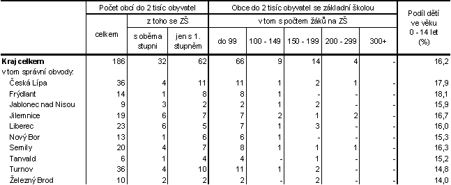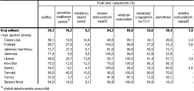 · Z pohledu technické vybavenosti je v Libereckém kraji dosažen vysoký podíl napojení obcí na veřejný vodovod – 95,8 %. Ve čtyřech správních obvodech – SO ORP Liberec, Nový Bor, Tanvald a Železný Brod jsou na veřejný vodovod napojeny dokonce všechny obce do nich spadající. Méně pozitivních výsledků dosahuje náš kraj v budování a provozování kanalizací s napojením na čističku odpadních vod. V kraji podíl obcí napojených na tuto kanalizaci dosáhl 35,6 % a mezi jednotlivými správními obvody existují značné rozdíly. Nejvyšší podíl vykázal SO ORP Tanvald (90,0 %), nejnižší SO ORP Turnov (13,5 %). Plynofikace byla zatím provedena v 39,4 % obcí kraje, ale ve správních obvodech Jablonec nad Nisou a Tanvald bylo plynofikováno 72,7 %, resp. 70,0 % obcí. Ve frýdlantském správním obvodu se podařilo na plyn napojit pouze 13,5 % obcí.