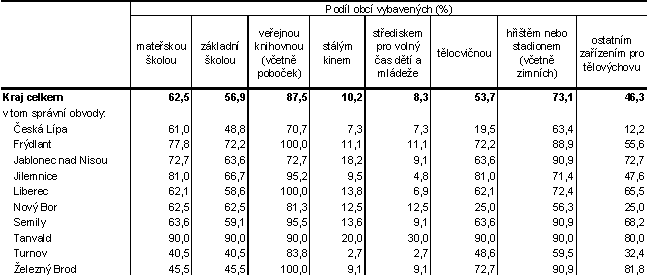 · Úroveň vybavenosti lze odvodit i z působnosti mateřské či základní školy, veřejné knihovny, kina a sportovních a jiných zařízení. Vysokou úrovní z tohoto pohledu se vyznačuje SO ORP Tanvald, ve kterém většina obcí patřící do jeho působnosti provozuje mateřskou školu, základních školu, veřejnou knihovnu, tělocvičnu, hřiště (podíly obcí dosahují shodně 90,0 %). Musíme však podotknout, že tento správní obvod je z hlediska počtu obcí tím nejmenším (10 obcí).
