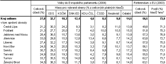 · Voleb do Evropského parlamentu se ve dnech 11. a 12. června 2004 v kraji zúčastnilo jen 27,0 % oprávněných voličů, nejvíce v ORP Železný Brod (34,5 %) a nejméně v OPR Česká Lípa (21,2 %). Celková volební účast ve volbách do Evropského Parlamentu v České republice činila 28,3 %.