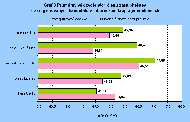 Graf 3 Průměrný věk zvolených členů zastupitelstev a zaregistrovaných kandidátů v Libereckém kraji a jeho okresech