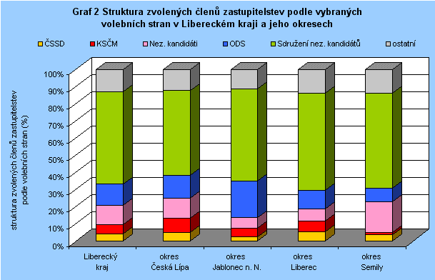 Graf 2 Struktura zvolených členů zastupitelstev podle vybraných volebních stran v Libereckém kraji a jeho okresech