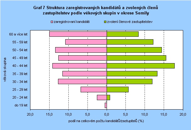 Graf 7 Struktura zaregistrovaných kandidátů a zvolených členů zastupitelstev podle věkových skupin v okrese Semily