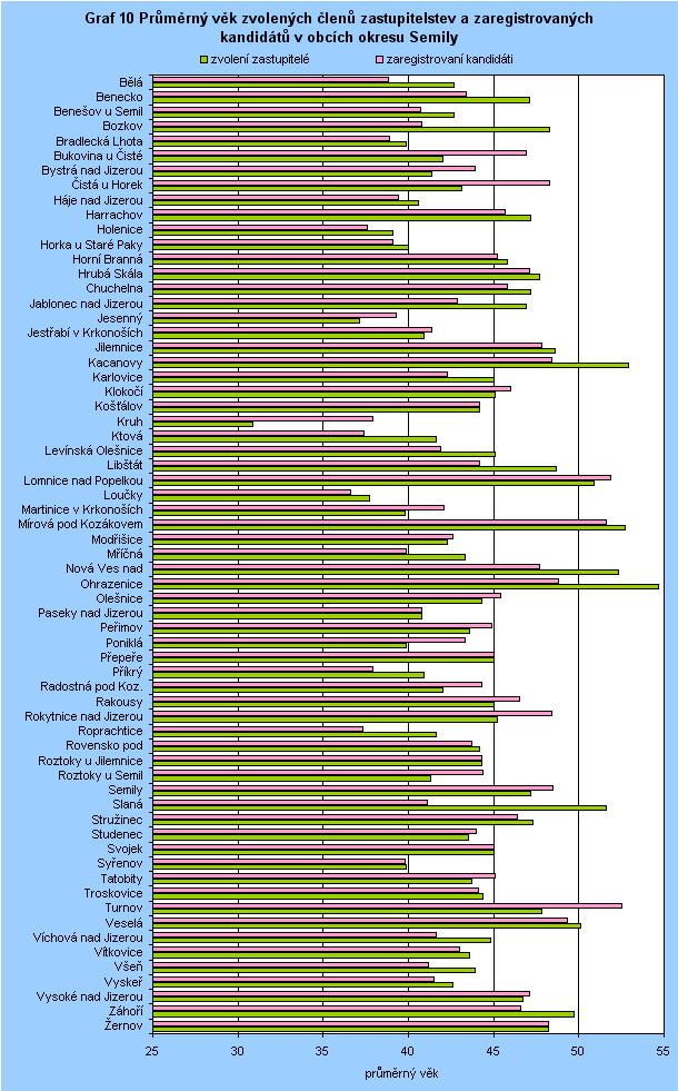 Graf 10 Průměrný věk zvolených členů zastupitelstev a zaregistrovaných kandidátů v obcích okresu Semily
