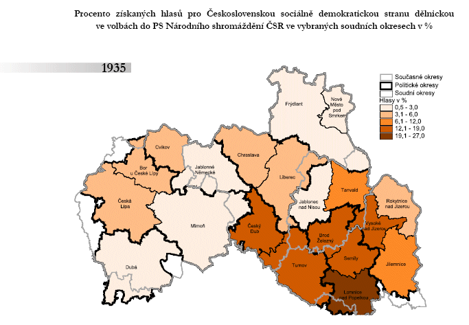 Procento získaných hlasů pro Československou sociálně demokratickou stranu dělnickou ve volbách do PS Národního shromáždění ČSR ve vybraných soudních okresech v %