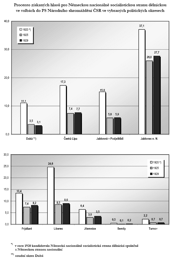 GRAFY Procento získaných hlasů pro Německou nacionálně socialistickou dělnickou stranu ve volbách do PS Národního shromáždění ČSR ve vybraných politických okresech v roce 1920, 1925, 1929 a 1935