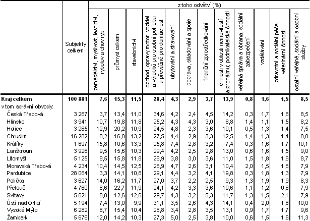 Mezi jednotlivými správními obvody existují v počtu subjektů významné rozdíly v závislosti na odvětví podnikání. Nejsilnější základnu subjektů v oblasti zemědělství, myslivosti a lesnictví má Králicko (zde připadá na 1 000 obyvatel 29 subjektů v tomto odvětví) a Holicko (27 subjektů). Co se týče zpracovatelského průmyslu, nejvíce subjektů v tomto odvětví je na Přeloučsku (v přepočtu na 1 000 obyvatel 46), Holicku (42) a Hlinecku (36), nejméně na Králicku (19 subjektů na 1 000 obyvatel), na Moravskotřebovsku a Svitavsku (shodně 22 subjektů). Relativně malé rozdíly jsou ve stavebnictví; nejvíce subjektů zabývajících se stavebnictvím je na Chrudimsku (26 na 1 000 obyvatel) a na Pardubicku (v přepočtu 25 subjektů), nejméně na Českotřebovsku, Lanškrounsku, Moravskotřebovsku a Ústeckoorlicku (shodně 19 subjektů na 1 000 obyvatel). Větší rozpětí je u obchodu – od 44 subjektů na 1 000 obyvatel na Moravskotřebovsku a 46 na Hlinecku po 60 subjektů na 1 000 obyvatel na Ústeckoorlicku a 68 subjektů na Pardubicku. Silné stránky Králicka coby centra cestovního ruchu dokazuje prvenství tohoto správního obvodu v počtu subjektů s hlavní činností v oblasti ubytování a stravování (13 subjektů na 1 000 obyvatel). Hlinecko je naopak centrem dopravy, skladování a spojů; zde připadá na 1 000 obyvatel 8 registrovaných subjektů s touto hlavní činností. Finanční zprostředkování se soustřeďuje zejména do centra kraje (na Pardubicku připadá na 1 000 obyvatel 10 subjektů v tomto oboru), nejméně finančníků působí na Hlinecku, Lanškrounsku, Moravskotřebovsku a Poličsku (vždy 5 subjektů na 1 000 obyvatel). Odvětví činnosti v oblasti nemovitostí a pronájmu úzce souvisí s ekonomickou vyspělostí správního obvodu, na Pardubicku dosahuje podíl registrovaných subjektů na 1 000 obyvatel 46, na Králicku pouhých 13 subjektů. Relativní počty subjektů ve veřejné správě, vzdělávání a zdravotnictví jsou poměrně vyrovnané.