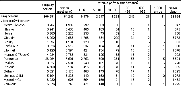 Z hlediska velikosti ekonomických subjektů podle počtu pracovníků se ve všech správních obvodech vyskytuje nejvíce subjektů bez zaměstnanců (zejména živnostníků). Druhou největší skupinou jsou podniky s 1 – 5 zaměstnanci. Rozdíly mezi jednotlivými správními obvody v počtu subjektů podle velikostních skupin podniků na 1 000 obyvatel kopírují rozdíly v relativním počtu subjektů celkem. Za zmínku stojí spíše absolutní čísla – počty podniků s největším počtem zaměstnanců. Ve skupině podniků s více než 500 zaměstnanci drží primát Pardubicko (15 subjektů, z toho nad 1 000 pracovníků zaměstnává 5 subjektů).