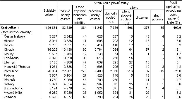 Celkový počet registrovaných ekonomických subjektů v přepočtu na 1 000 obyvatel je největší na Pardubicku (233 subjektů), dále na Holicku (207) a Přeloučsku (201). Nejméně registrovaných subjektů celkem na 1 000 obyvatel připadá na Moravskotřebovsku (154), dále na Českotřebovsku (171) a na Svitavsku (177). Ostatní správní obvody mají relativní počet subjektů poměrně vyrovnaný. Stejný poměr platí i u počtu fyzických osob – živnostníků. Samostatně hospodařících rolníků je nejvíce na Holicku (na 1 000 obyvatel jich připadá 24), dále na Žambersku a na Poličsku (shodně 21). Nejméně samostatně hospodařících rolníků je zaregistrováno na Českotřebovsku (na 1 000 obyvatel jich připadá 5) a Pardubicku (6 subjektů na 1 000 obyvatel).