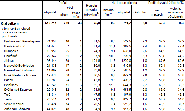 Celkem 33 měst, které v kraji existovaly ke dni sčítání 2001, bylo po jeho území rozmístěno značně nerovnoměrně. V šesti správních obvodech se nacházelo jediné město, tedy sídlo obecního úřadu s rozšířenou působností (Bystřice nad Pernštejnem, Humpolec, Náměšť nad Oslavou, Nové Město na Moravě, Pacov a Telč). Protikladem byl obvod Pelhřimov se šesti městy. Podíl městského obyvatelstva byl nejvyšší v obvodu Jihlava (67,6 %), za kterým těsně následoval obvod Pelhřimov (66,3 %), nejmenší byl v obvodech Bystřice nad Pernštejnem a Náměšť nad Oslavou (shodně 37,2 %).