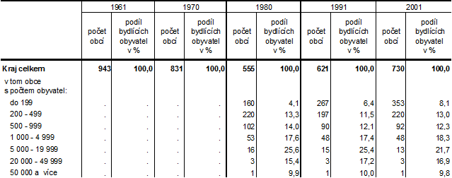 Nejmenších obcí do 199 obyvatel bylo 353, což představovalo 48,4 % celkového počtu obcí. Ovšem na počtu obyvatel kraje se tyto obce podílely pouze 8,1 %. Obce s 200 - 499 obyvateli, kterých bylo 220, měly 67 326 obyvatel, což bylo 13,0 % populace kraje. Tedy obce s méně než pěti sty obyvateli, jež se na celkovém počtu obcí kraje podílely 78,5 %, měly na jeho obyvatelstvu podíl pouze 21,1 %. Na opačném konci stojí pouhá čtyři největší města s více než 20 000 obyvateli, v nichž k datu sčítání žilo 26,7 % obyvatel kraje.