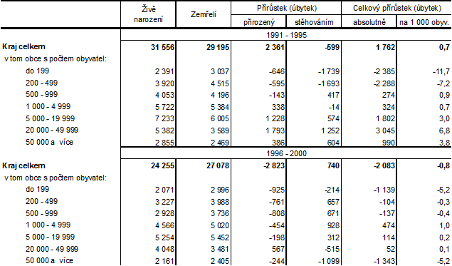 Malé obce ztrácely obyvatelstvo i po celé poslední desetiletí – zejména to platí pro první polovinu devadesátých let. Ubývalo v nich obyvatel jak přirozenou měnou (zemřelí převažovali nad narozenými), tak vlivem záporného migračního salda. Zajímavé je ale, že v druhé polovině devadesátých let u většiny velikostních skupin obcí (s výjimkou obcí do 199 obyvatel a měst s 20 000 a více obyvateli) převládalo aktivní saldo migrace. V této souvislosti stojí za povšimnutí výrazná převaha vystěhovalých nad přistěhovalými v Jihlavě, což v kombinaci s úbytkem obyvatel přirozenou měnou znamenalo, že v krajském městě byl zaznamenán stejný relativní úbytek obyvatel jako v obcích do 199 obyvatel (-5,2 na 1 000 obyvatel).
