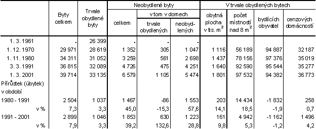 Celková obytná plocha v trvale obydlených bytech vzrostla o 9,8 %. Proti sčítání v roce 1991 se nárůst projevil také u počtu místností nad 8 m2, a to o 5,3 %. Počet cenzových domácností v trvale obydlených bytech se zvýšil o 4,2 %.