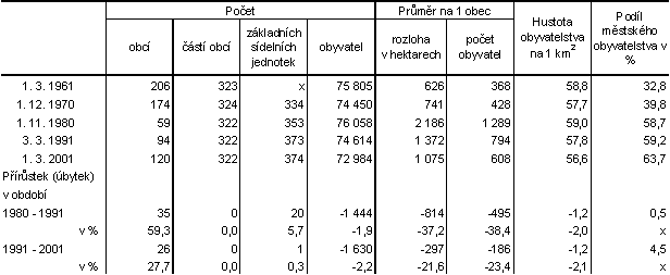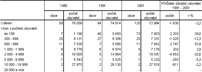 K nejvýraznějšímu růstu došlo v uplynulém desetiletí u nejmenší velikostní skupiny obcí (do 199 obyvatel), jejichž počet se zvýšil o 26, tj. o 27,6 % a počet obyvatel o 2 203 (o 39,0 %). Současně se však velmi snížila průměrná velikost obcí této kategorie (ze 123 obyvatel roku 1991 na 108 v roce 2001). Z ostatních velikostních skupin obcí se výrazněji zvýšil počet obcí i obyvatel v kategorii 500-999 obyvatel a snížení bylo zaznamenáno v kategorii 2 000-4 999 obyvatel. U ostatních skupin došlo jen k nepodstatným posunům.