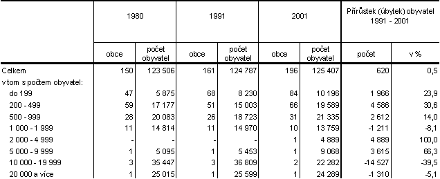 Z hlediska počtu obyvatel docházelo v sídelní struktuře okresu k postupnému vylidňování venkovských obcí a zvyšování počtu obyvatel ve městech. Tento trend se v průběhu posledních deseti let zastavil a k datu posledního sčítání doznal dokonce pokles. Podíl obyvatelstva bydlícího v obcích do 199 obyvatel vzrostl z 6,6 % v roce 1991 na 8,1 % v roce 2001. Ve velikostní skupině obcí s počtem obyvatel od 200 do 999 byl nejnižší podíl obyvatel v roce sčítání 1991 (27,0 %) zatímco v roce 2001 se toto procento zvýšilo na 32,6. K nárůstu počtu obyvatel o 24,6 % za posledních deset let dochází také u obcí ve velikostní skupině s 1 000 – 4 999 obyvateli. Ve velikostní skupině obcí s 5 000 a více obyvateli dochází k poklesu o 18,0 %. Je to úbytek převážně městského obyvatelstva o více než 12 000.