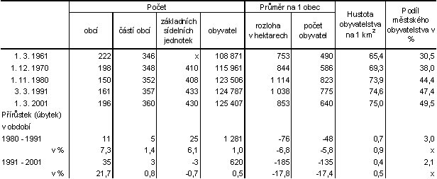S uskutečněnými územními změnami se měnila průměrná velikost obcí z hlediska počtu obyvatel a rozlohy. Průměrný počet obyvatel na 1 obec byl nejnižší v roce 1961, kdy činil 490 obyvatel, nejvyšší byl v roce 1980 (823 obyvatel). V době posledního sčítání v roce 2001 byl průměr na 1 obec 640 obyvatel. Obdobně se vyvíjela i průměrná katastrální rozloha obce.
