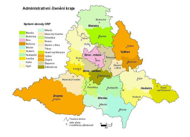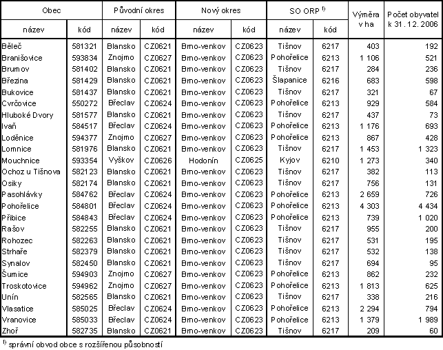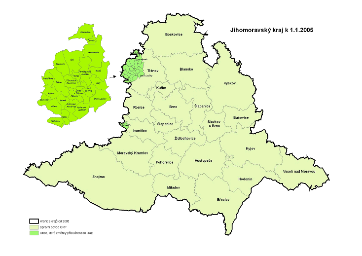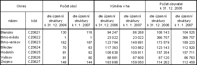 | Od rozdělení federace na Českou republiku a Slovenskou republiku od 1. ledna 1993 došlo k první významné úpravě územního uspořádání k 1. lednu 2000, kdy nabyl účinnosti ústavní zákon č. 347/1997 Sb., o vytvoření vyšších územních samosprávních celků. Tímto zákonem bylo území České republiky rozděleno na 14 krajů. Z bývalého Jihomoravského kraje 7 ze 14 okresů bylo převedeno do jiných krajů, a to okresy Jihlava, Třebíč a Žďár nad Sázavou do kraje Vysočina, okres Prostějov do Olomouckého kraje a okresy Kroměříž, Uherské Hradiště a Zlín do Zlínského kraje. Na území Jihomoravského kraje bylo k 1. lednu 2000 celkem 647 obcí, z nich 1 bylo statutární město a dalších 43 mělo statut města. Vývoj počtu obcí v okresech Jihomoravského kraje ![]() K další podstatné změně ve vymezení území Jihomoravského kraje, a tím i okresu Brno-venkov, došlo od 1. ledna 2005, kdy na základě zákona č. 387/2004 bylo 25 obcí z kraje Vysočina převedeno do Jihomoravského kraje. Jedná se o obce Borač, Borovník, Černvír, Dolní Loučky, Doubravník, Drahonín, Horní Loučky, Kaly, Katov, Křižínkov, Kuřimská Nová Ves, Kuřimské Jestřabí, Lubné, Nedvědice, Níhov, Olší, Pernštejnské Jestřabí, Rojetín, Říkonín, Skryje, Tišnovská Nová Ves, Újezd u Tišnova, Vratislávka a Žďárec (z okresu Žďár nad Sázavou do okresu Brno-venkov) a Senorady (z okresu Třebíč do okresu Brno-venkov). Základní údaje o okresech Jihomoravského kraje ![]() S účinností od 1. ledna 2007 nabyla platnosti vyhláška č. 513/2006 Sb., ze dne 3. listopadu 2006, kterou se mění vyhláška č. 564/2002 Sb., o stanovení území okresů České republiky a území obvodů hlavního města Prahy, ve znění pozdějších předpisů a týká se pouze vnitřního členění kraje. Smyslem nové vyhlášky je sladění území okresů se správními obvody obcí s rozšířenou působností. Jedná se o případy, kdy správní obvody ORP byly vytvořeny přes hranice okresů. V Jihomoravském kraji došlo ke změně hranic všech okresů kromě okresu Brno-město, změna se týkala spádovosti 26 obcí. Do okresu Brno-venkov přibylo 25 obcí, a to 14 obcí z okresu Blansko, 7 z okresu Břeclav a 4 z okresu Znojmo, do okresu Hodonín byla převedena 1 obec z okresu Vyškov. Okres Brno-venkov se tak v rámci České republiky stal okresem s největším počtem obcí (187obcí).