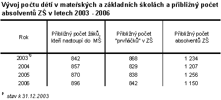 Mateřské školy měly k 1. 9. 2003 celkovou kapacitu 3 409 dětí. K 30. 9. 2003 mateřské školky navštěvovalo celkem 2 857 dětí. Jen velmi málo školek má plně využitu svou kapacitu. Ostatní školky se potýkají s nižším počtem dětí, jejichž věk odpovídá docházce do školky. Také kapacita základních škol není plně využita. K 1. 9. 2003 byla rovna 12 898 žáků, ale ve skutečnosti se v nich k 30. 9. 2003 učilo pouze 8 695 dětí.