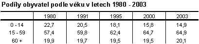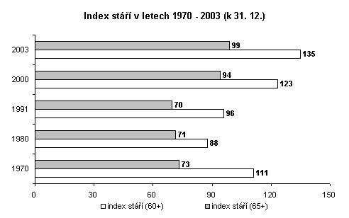 Budeme-li věkovou strukturu obyvatelstva hodnotit ukazatelem „index stáří“ (poměr dětské složky v populaci k obyvatelstvu v poproduktivním věku), zjistíme, že na 100 dětí ve věku 0 –14 let připadalo v roce 1970 celkem 111 osob starších 60 let, resp. 73 osob starších 65 let. V roce 2003 poměr dětí k počtu osob v poproduktivním věku vzrostl. Na 100 dětí připadalo 135 osob starších 60 let, resp. 99 osob starších 65 let. Bude-li se i nadále rodit méně dětí, je zřejmé, že budoucí populace ekonomicky aktivních bude příliš malá na to, aby uživila budoucí důchodce.