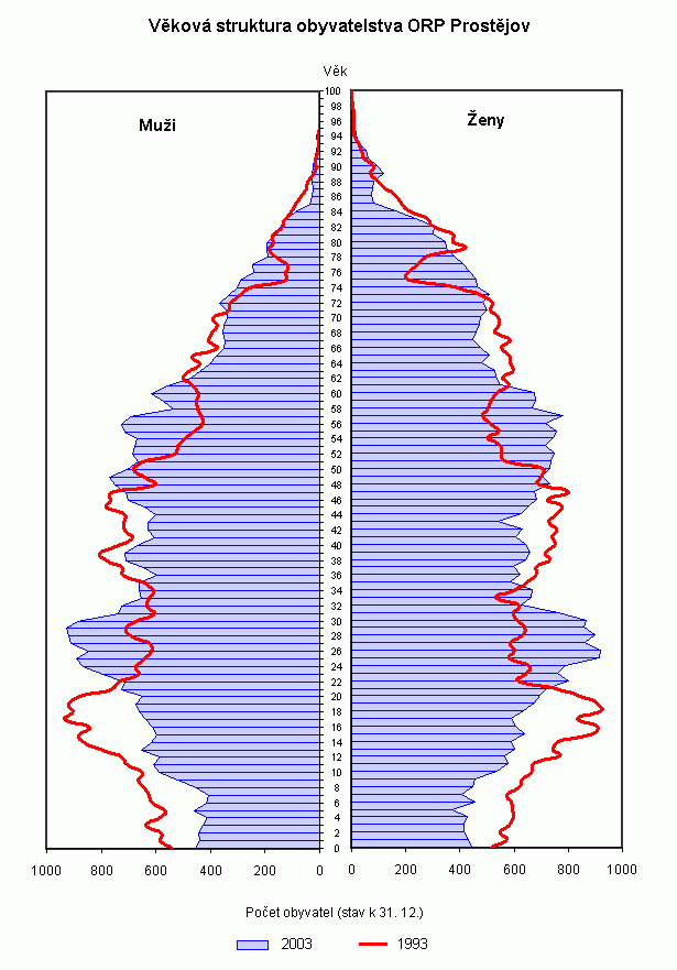 Klesající úmrtnost a prodlužující se střední délka života se ve vývoji věkové struktury obyvatel projevuje stálým růstem podílu obyvatel vyšších věkových skupin. Vývoj demografických změn je dobře vidět na kresbě „stromu života“ (graf „Věková struktura obyvatelstva ORP Prostějov“). Strom života se oproti předchozím 10 letem začíná deformovat. Zmenšuje se základna „stromu života“, tzn. klesající porodnost. Z tvaru „stromu života“ je patrná zvýšená porodnost po ukončení 2. světové války, která zůstala zachována přibližně do poloviny padesátých let. Vznikla tak nová početná generace dnešních 24 – 30 letých mladých lidí. Bohužel od osmdesátých let porodnost stále klesá i přesto, že poslední „silné“ ročníky jsou ve fertilním věku.