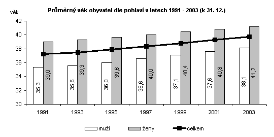 Obyvatelstvo stárne. Průměrný věk obyvatel se od roku 1991 zvyšuje. Zatímco k 31. 12. 1991 byl průměrný věk mužů 35,3 let, o dvanáct let později se již muži dožívali v průměru o 2,8 let vyššího věku. Stejně je tomu i v ženské populaci. Za posledních 12 let vzrostl průměrný věk žen o 2,2 let. Navíc ženy se dožívají vyššího věku než muži. Ve věkové skupině 85 a více letých bylo v roce 1991 téměř třikrát více žen než mužů a tyto rozdíly se stále zvyšují. V roce 2003 již připadlo na 100 mužů starších 85 let 301 žen stejného věku.