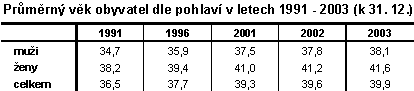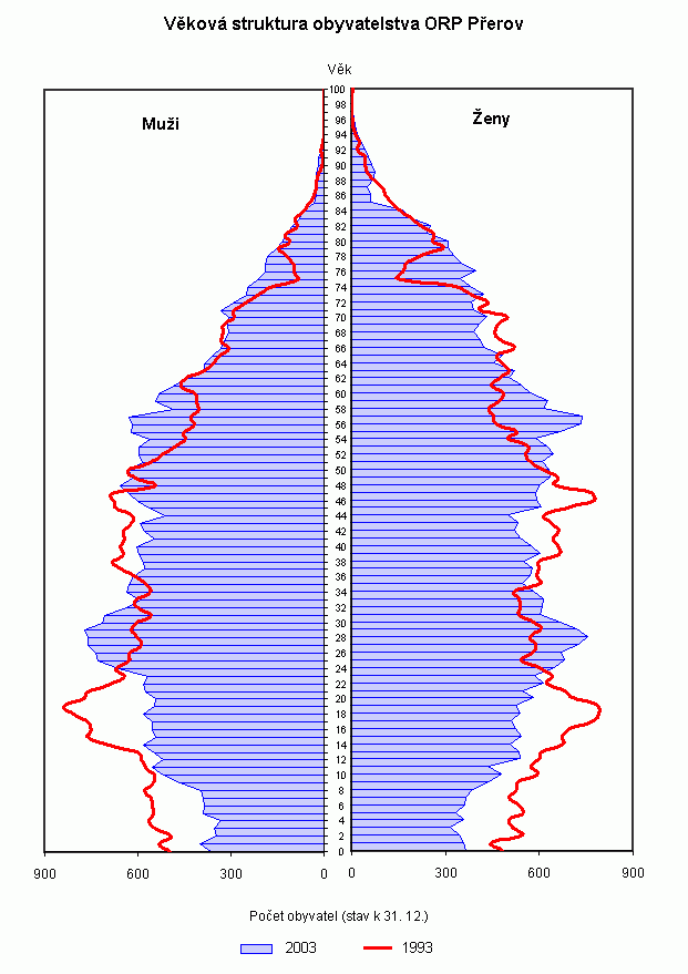 Průměrný věk obyvatel neustále roste. Zkvalitnila se lékařská péče a tedy i kondice nezanedbatelné části populace. V důsledku toho vzrůstá počet obyvatel v produktivním a poproduktivním věku. Ženy se v průměru dožívají vyššího věku než muži. Zatímco k 31. 12. 2003 byl průměrný věk mužů 38,1 let, průměrný věk žen byl o 3,5 let vyšší, tedy 41,6 let. Vzhledem k průměrnému věku obyvatel je obec s rozšířenou působností Přerov nejstarším správním obvodem mezi všemi 13 správními obvody Olomouckého kraje.