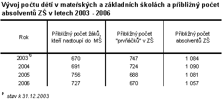 Mateřské školy měly k 1. 9. 2003 celkovou kapacitu 2 885 dětí. K 30. 9. 2003 však mateřské školky navštěvovalo pouze 2 167 dětí. Některé školky se potýkají s nižším počtem dětí, jejichž věk odpovídá docházce do školky. V některých případech je počet dětí výrazně nižší než kapacita školek. Také kapacita základních škol není plně využita. K 1. 9. 2003 byla rovna 10 650 žáků, ale ve skutečnosti se v nich k 30. 9. 2003 učilo pouze 7 832 dětí.