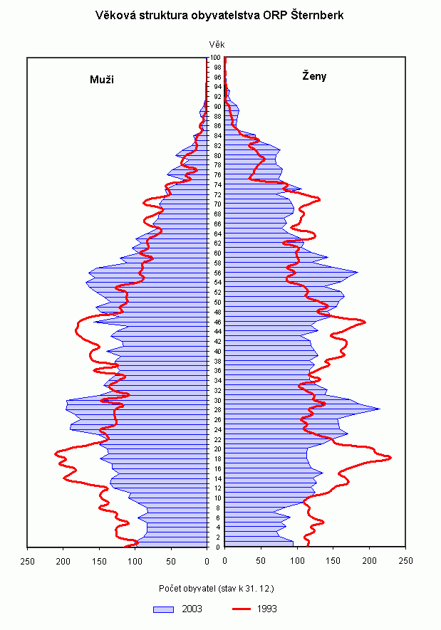 Pro ilustraci jsou demografické změny dobře viditelné na vzhledu „stromu života“ (graf „Věková struktura obyvatelstva ORP Šternberk“), kdy při posouzení vývoje věkové struktury obyvatel v roce 1993 a o 10 let později, tj. v roce 2003 jsou nepřehlédnutelné změny ve věkovém složení populace v ORP Šternberk. Při pohledu na graf je vidět zúžená základna počtu narozených dětí v roce 2003 oproti roku 1993. Zeštíhluje se střední část populace a rozšiřuje se část nad 50 let u mužů i žen s protaženým vrcholem přesahujícím stále významněji hranici 80-85 let. Růst populace velmi starých osob má výraznou dynamiku nejvíce zřetelnou u žen.