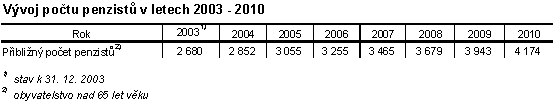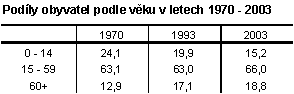 Index stáří vyjadřuje poměr počtu obyvatel ve věku 65 a více let k počtu obyvatel mladších 15 let. Z údajů je zřejmé, že v roce 1991 na 100 dětí ve věku do 14 let připadlo 56 penzistů, ale v roce 2003 na 100 dětí do 14 let už to bylo 90 penzistů.