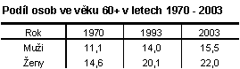 Mužů ve věku 60 a více let v roce 1970 trvale žilo na území OPR celkem 1 054 a v roce 2003 jejich počet dosáhl 1 475 osob. Celkový počet žen v roce 1970 se rovnal počtu 1 429, ale v roce 2003 měly ženy skoro dvojnásobnou početní převahu nad muži. V ORP žilo 2 204 žen, což jsou skutečně markantní rozdíly, které se budou v dalších letech čím dál tím více zvětšovat a nejvíce rostoucím typem domácnosti budou právě domácnosti jednotlivců, respektive osamělých, ovdovělých žen ve vysokém věku.