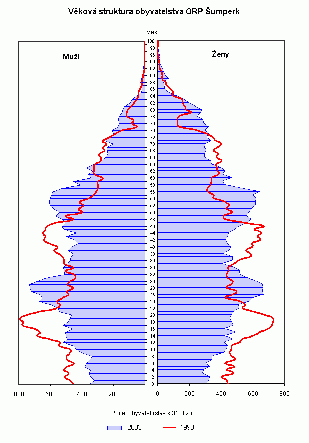 Demografické změny jsou dobře viditelné na vzhledu „stromu života“ (graf „Věková struktura obyvatelstva ORP Šumperk“), když srovnáme vývoj věkové struktury obyvatel v roce 1993 a o 10 let později, tj. v roce 2003. Změny jsou nepřehlédnutelné. Na grafu je vidět zúžená základna počtu narozených dětí v roce 2003 ve srovnání s rokem 1993. Jsou zde patrné silné ročníky populace ze 70. a 80. let a zeštíhlená střední část populace. Část populace nad 48 let u mužů i žen je rozšířená s protaženým vrcholem přesahujícím stále významněji hranici 75 a více let. Růst populace velmi starých osob má výraznou dynamiku nejvíce zřetelnou u žen.