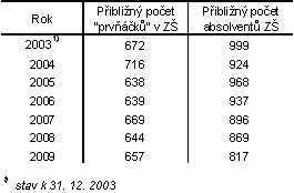 V ORP Šumperk je celkem 43 MŠ s celkovou kapacitou 2 505 dětí (k 30. září 2003 se skutečný počet dětí v MŠ rovnal 2 072 předškoláků). Přestože kapacita základních škol na území ORP je celkem 10 222 žáků, počet těch, kteří se vzdělávali v ZŠ, dosáhl na konci září 2003 počtu 7 090 dětí. Mnoho školáků dojíždí do ZŠ z okolních obcí. Každá obec má možnost vycházet z tabulky v příloze, kde jsou uvedeny počty žáků, kteří nastoupí do 1. třídy v následujících letech a připravit se na realitu, která je čeká.