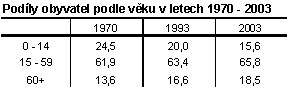 Index stáří je jedním z ukazatelů, který zcela průkazně zviditelní změny v populaci. Vyjadřuje poměr počtu obyvatel ve věku 65 a více let k počtu dětí mladších 15 let. Z údajů je zřejmé, že v roce 1991 na 100 dětí ve věku do 14 let připadlo 55 seniorů, ale v roce 2003 na 100 dětí do 14 let už to bylo 86 seniorů.